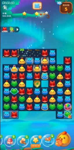 开局阶段建议从下方冰块入手,逐步向两侧区域推进,这样可以有效扩大活动空间。在推进过程中,毛球的干扰需要耐心应对,不要因为急切而浪费步数。消除的进行,毛球会逐渐暴露,为后续步骤创造条件。飞碟会不断吸引金豆荚上升,这时必须通过消除下方动物来让金豆荚回落,每一步移动后都要仔细观察其位置变化。