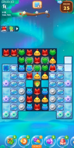 章鱼怪吐出的毒液必须优先消除,防止其蔓延后占据关键位置。毒液的扩散会压缩玩家的操作空间,因此提前清理能保持局面的可控性。两侧的冰块是这一关的难点所在,通常需要多次横向消除才能有效破解。当底部空间被打开后,可以集中火力处理这些区域。