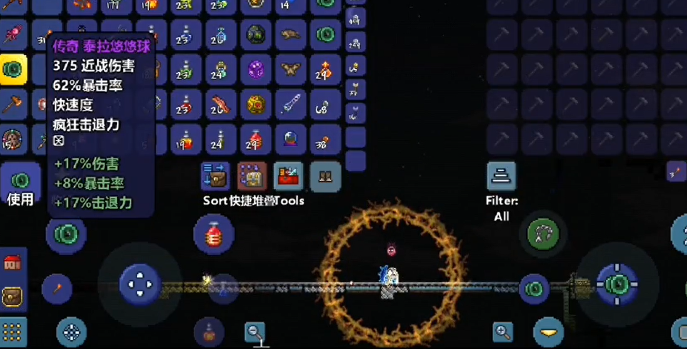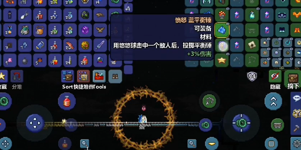 为了最大化悠悠球的战斗力,玩家可以进一步整合高级配饰。悠悠球手套可以从困难模式中随机出现在洞穴层的骷髅商人处以50金币的价格购买,它允许玩家同时使用两个悠悠球。将该手套与白绳以及任意颜色的平衡锤在工匠作坊处合成,便可制作出功能整合的悠悠球袋,此配饰同时提供了双悠悠球、平衡锤辅助攻击和增加射程的全部效果,使战斗效率成倍提升。