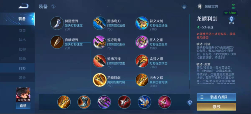 打野李元芳的核心是围绕攻速、暴击和物理穿透来构建,以最大化其前中期的爆发能力和推进速度。出门装选择狩猎宽刃,随后优先合成追击刀锋(蓝色打野刀),它能显著提升清野效率,其被动对远程英雄同样生效,是李元芳快速刷野的关键。鞋子通常选择急速战靴来补充攻速,若敌方控制较多则可替换为抵抗之靴。核心输出装备依次为暗影战斧、无尽战刃和破晓。暗影战斧提供冷却缩减、生命值和物理穿透,增强前期抓人能力;无尽战刃大幅提升暴击伤害;破晓则是射手应对高护甲坦克的终极武器。最后一件装备可根据局势在破军、泣血之刃或保命装之间选择,破军进一步强化收割能力,泣血之刃提供续航,而名刀·司命或贤者的庇护则用于提高容错率。