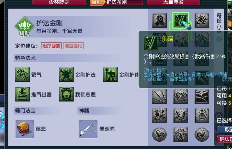 护法金刚流派有较为明确的倾向。第一层的佛屠经脉能提升金刚护法对召唤兽的加成效果,对于携带须弥等攻宠的队伍是不错的增强。第二层经脉中,磅礴因其较高的触发概率和稳定的回复效果提升,成为泛用性最广的选择,其期望收益较为可观。若队伍配置偏向持久战且自身蓝量充足,仁心的叠加效果也能提供强大的后续治疗。第四层经脉通常建议选择无碍,它能提升一苇渡江的状态效果,增强团队的机动性,相较于同层其他选项更为实用。