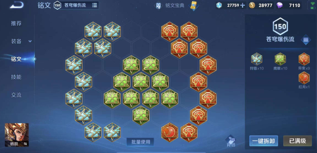 铭文搭配是强化杨戬打野节奏不可或缺的一环,一套好的铭文能让前期的刷野和首波gank更加顺畅。推荐搭配是:红色铭文选用5个异变和5个红月,异变提供物理攻击和穿透,红月则提供攻击速度和少量暴击,使普攻手感更丝滑同时也能偶尔触发惊喜。蓝色铭文选择8个狩猎和2个隐匿,狩猎提供的攻速和移速对刷野和追击帮助很大,隐匿补充的物理攻击则进一步强化技能伤害。绿色铭文毫无疑问选择10个鹰眼,高额的物理穿透是战士类英雄前期建立伤害优势的关键。这套铭文整体兼顾了攻击、穿透、攻速和移速,非常契合杨戬依赖技能穿插普攻的输出模式。