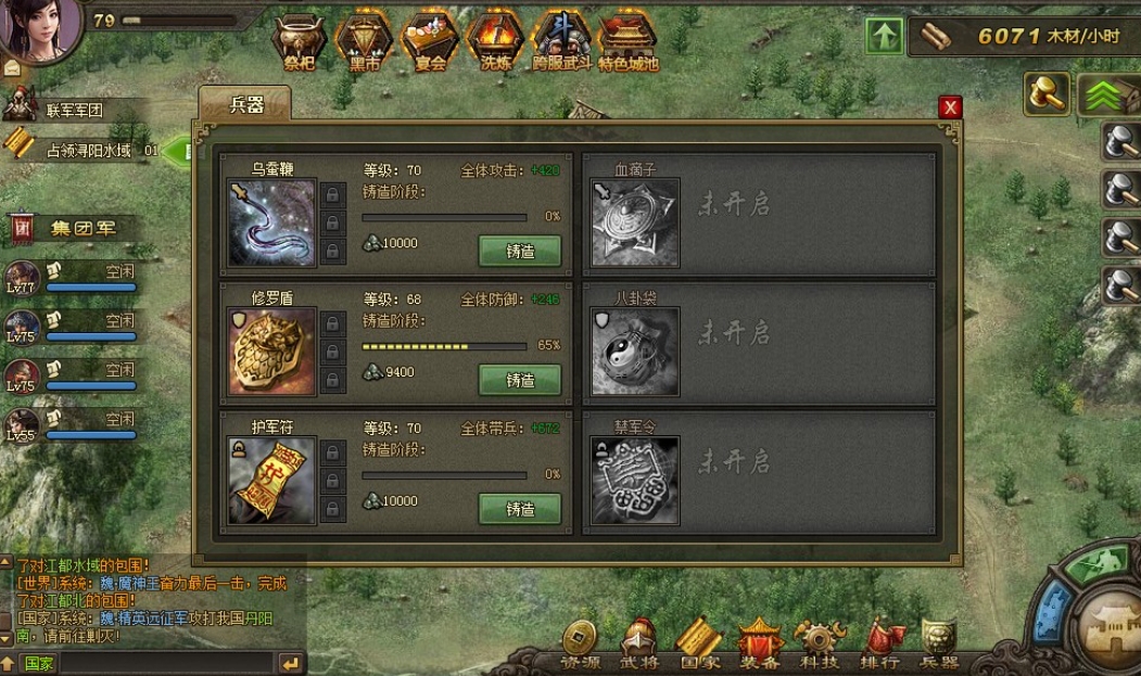 兵器解锁需跟随主线任务推进,50级完成对应主线击败指定NPC后开启乌蚕鞭、修罗盾、护军符三件基础兵器,80级完成高阶主线任务解锁血滴子、八卦袋、禁军令三件高阶兵器,未完成对应主线任务时兵器入口处于锁定状态。解锁后需通过挑战副本NPC获取兵器图纸,集齐单件兵器所需全部图纸后,消耗银币完成基础生产,生产完成的兵器仅具备基础属性,需持续消耗镔铁进行铸造升级,每积累指定数量升级点即可提升兵器等级,攻击、防御、兵力三类属性随等级同步提升。