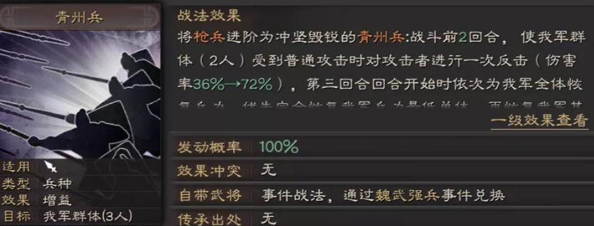 张郃承担团队承伤与控场职责,枪兵S适性保障兵种收益。战法携带锋矢阵,强化主将乐进输出,同时降低自身承伤压力,搭配横戈跃马,前几回合降低法系伤害,后期提升兵刃伤害,兼顾生存与团队辅助。兵书选诱敌之策干扰敌军,励军提升团队兵刃伤害,救主保障核心队友生存,加点全统率,最大化坦度与辅助效果。