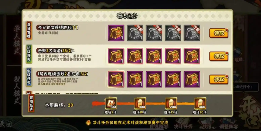 决斗场周胜是每周金币收入的核心大头,累计完成20场忍术对战胜利,即可一次性领取600金币,即便操作熟练度一般,通过匹配机制稳步完成场次也能顺利拿到,搭配每周决斗任务的额外奖励,整体收益十分可观。组织玩法同样不容错过,加入活跃组织后,每日参与组织祈福、组织副本与要塞争夺战,可获得大量金币与组织贡献,贡献能在组织商店兑换道具,节省金币开支,每周的组织红包与签到奖励也能补充零散金币,长期积累下来数量可观。同时不要忽略每周签到福利,固定金币、体力与道具奖励,能进一步提升日常资源储备,为金币累积减负。
