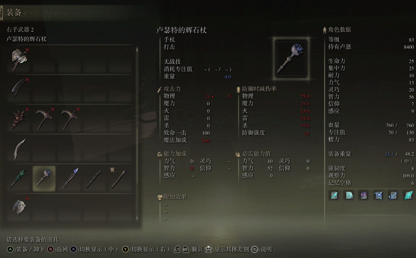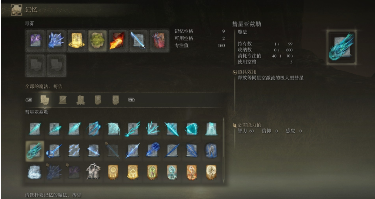 后期加点以智力60为软目标,配合40点集中力保证蓝量充足。装备方面,卢瑟特的辉石杖虽然耗蓝高,但伤害提升显著,适合BOSS战;日常清怪可以切回名刀平砍。护符推荐魔法师块、黄金树恩惠和拉达冈肖像,强化输出和生存。打最终BOSS时,召唤骨灰吸引仇恨,躲在后方用彗星亚兹勒疯狂输出,注意保持距离躲技能就行。通关后记得去洗点尝试不同流派,比如魔剑双修。