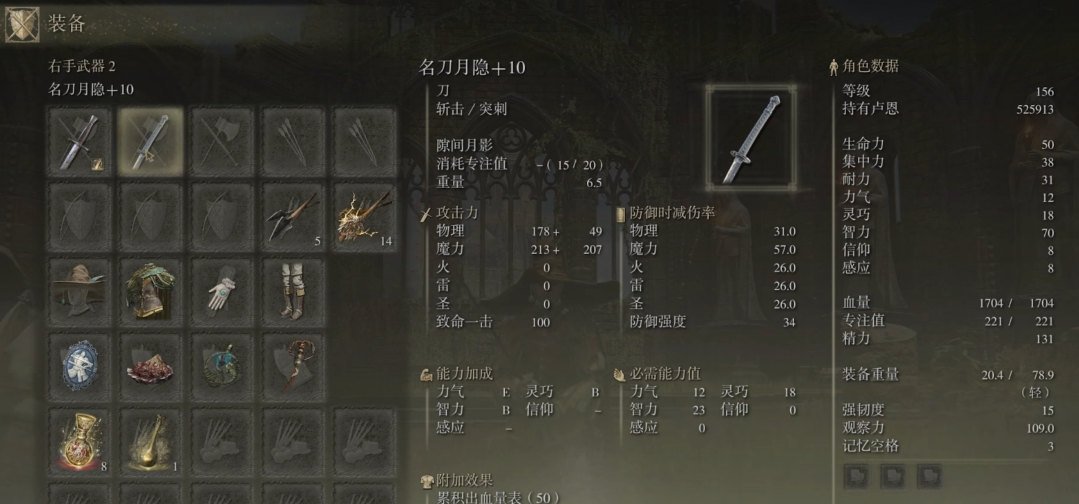武器除陨石杖外,名刀月隐是法师近战过渡的优质选择,战技居合斩兼具削韧与远程剑气,获取需击败盖尔坑道的熔岩土龙BOSS。护符搭配需注重功能性,初期推荐魔法师块护符与蓝琥珀锁链组合,前者强化输出,后者弥补蓝量不足。后期可补充拉达冈肖像提升施法速度,或葛孚雷肖像增强蓄力法术伤害。骨灰推荐离群野狼或腐败野狗,前者牵制力强,后者附带猩红腐败异常状态。